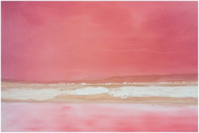 Aerial photograph of a striking pink salt lake lan