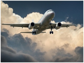 A commercial airplane flying through dramatic clouds, showcasing aviation in action.