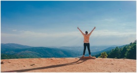 A man raises his arms in triumph on a rocky mountain summit overlooking a vast landscape