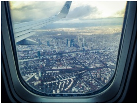 Stunning aerial view of Frankfurt am Main through an airplane window, showcasing the city's skyline and architecture.