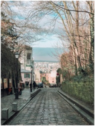 Picturesque cobblestone street in Montmartre with city view, capturing Parisian charm.