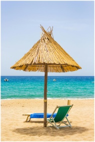 Serene beach scene in Sardinia, Italy featuring a sunshade and lounge chairs by turquoise waters.