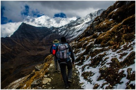 Two hikers navigating a snowy trail in rugged mountainous terrain under dramatic skies.