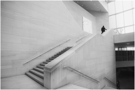 Black and white image of a minimalist modern staircase indoors with a single person ascending.