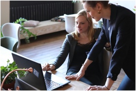 Two professional women discuss a project using a l
