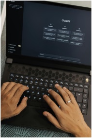Hands typing on a laptop displaying the ChatGPT in