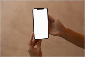 Hands holding a smartphone with a blank screen, pe