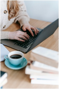 Crop anonymous female freelancer surfing netbook while sitting at wooden table with cup of hot coffee and books in room