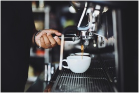 Close-up of a barista preparing espresso in a café using a machine