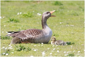 A greylag goose with goslings on a sunny, grassy meadow surrounded by daisies.