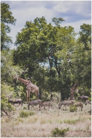 A herd of zebras and a giraffe in their natural habitat in South Africa's savanna.