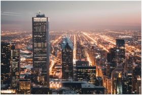 Aerial view of Chicago's illuminated skyline at dusk, showcasing vibrant city lights.