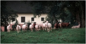 A peaceful herd of sheep grazing near a farmhouse in rural Austria.