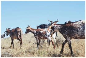 Herd of spotted goats grazing on dry grassland und