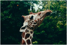 A detailed close-up of a giraffe in a lush, green