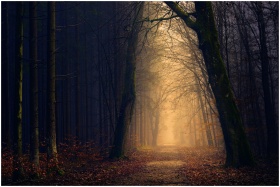 Explore the serene beauty of a misty forest path at dawn surrounded by autumnal trees.