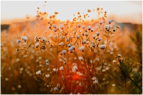 Field of wildflowers glowing in the golden hour sunlight, capturing natural beauty and serenity.