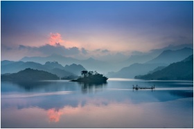 Tranquil lake with misty mountains at sunrise in Thượng Lâm, Vietnam.