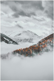 A breathtaking view of snow capped mountains and foggy forest with autumn colors.