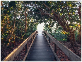 A serene wooden boardwalk leading to a beach, enveloped by lush green foliage and sunlight.