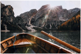 Wooden boat sailing on a serene mountain lake with sunrays illuminating the scenic landscape.