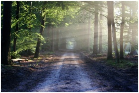 Peaceful forest pathway with sunrays filtering through trees, creating a serene atmosphere.