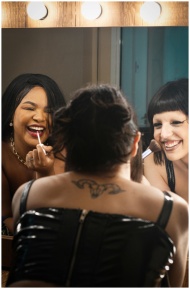 Two friends share a joyful moment applying makeup in front of a vanity mirror with lights.