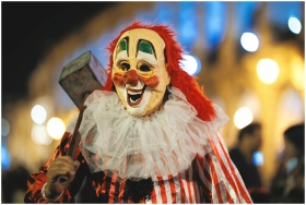 A clown in a vibrant costume participates in the Arequipa Halloween parade at night.