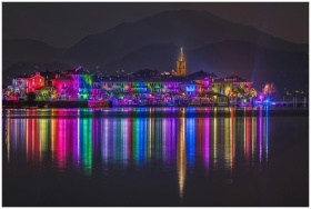 Bright colored lights reflecting on a tranquil lake at night in a vibrant village setting.
