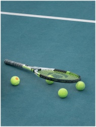 Tennis racket and balls on a blue court surface un
