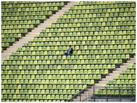 A solitary figure sits among green and yellow stadium seats, capturing a moment of solitude in München, Germany.