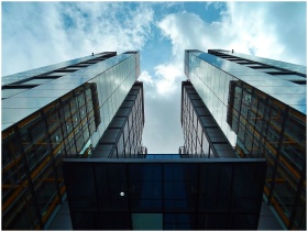 Low-angle view of sleek, modern skyscrapers with g