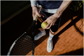 A tennis player prepares for a serve, holding a ra