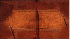 Drone shot of a tennis match on a clay court with