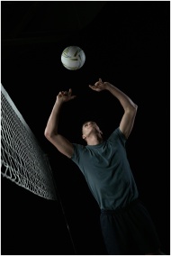 Athlete in action, leaping for a volleyball spike during an intense match.
