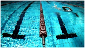 A person swimming in a clear blue outdoor pool with lane dividers.