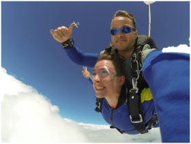 Tandem skydivers enjoying an exhilarating freefall through clear blue skies.