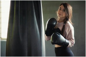 A young woman with boxing gloves trains in an indo
