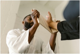 Martial artist breaking a board during training in dojo. Intense focus and skill.