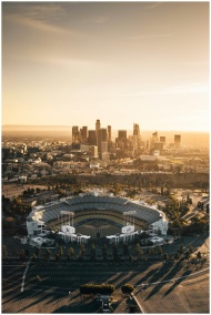 Stunning aerial shot of Dodger Stadium with Los Angeles skyline at sunset.