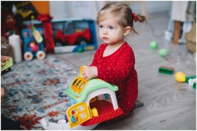 Adorable toddler in red outfit playing with toy ho