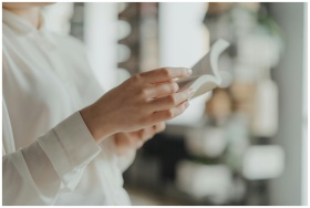 Hands holding and flipping through a book with a soft focus library background.