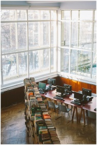 Library with large windows, bookshelves, and compu