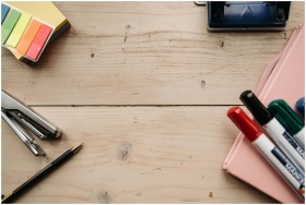 Top view of office supplies including markers, stapler, and notepad on a rustic wooden table.