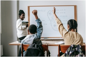 Students actively participating in a biology lesson with a teacher explaining at the whiteboard.
