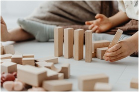 Young child engaging with wooden blocks, encouragi