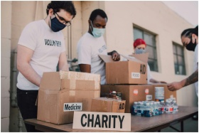 Group of volunteers wearing masks organizing donation boxes labeled food and medicine outdoors.