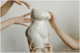 Hands gently holding and interacting with a uniquely shaped ceramic pottery piece indoors.