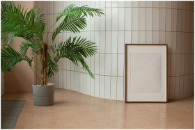 Minimalist interior featuring a potted palm and blank framed art against a tile wall.