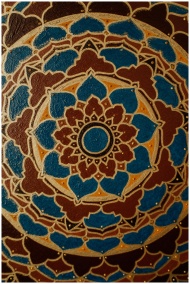 Detailed close-up of a mandala artwork with blue, brown, and gold patterns showcasing ornamental symmetry.